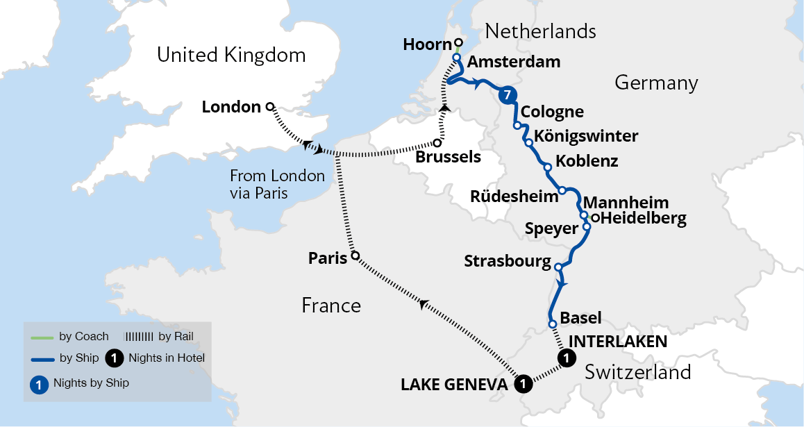 Enjoy one of the world's finest rail journeys aboard the legendary Glacier Express to Zermatt, and admire Matterhorn views from the charming Gornergrat Railway. Descending the Alps, set sail on a sensational Rhine cruise, indulging in luxurious amenities and superb service. Enroute, savour incredible vistas of the stunning Rhine Gorge, wander...